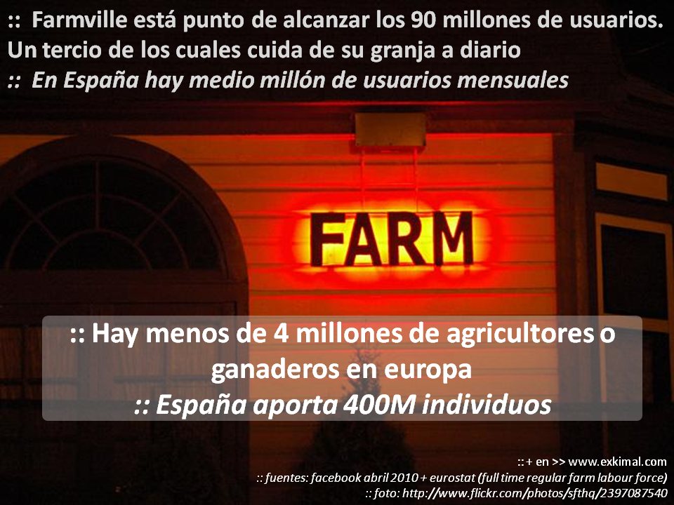 a finales de abril del 2010, farmville está punto de alcanzar los 90MM de usuarios mundiales. Un tercio de los cuales cuida de su granja a diario. en españa hay medio millón de usuarios mensuales.